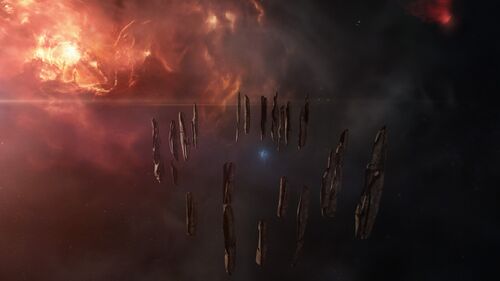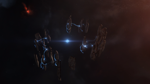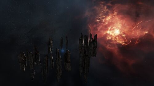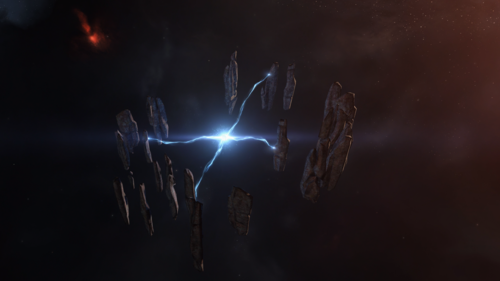 Clear Water Spring is a tranquil and strikingly symmetrical formation of tall, thin stone monoliths, arranged like silent sentinels around a central energy focus. Set against the warm, red-orange glow of the local nebulae, the pillars seem to hover effortlessly in the void, evoking a sense of ancient ritual or forgotten purpose. At the heart of the formation floats a perfect sphere of glowing blue energy. Every 5 minutes, it releases a brilliant electric-blue arc that dances across the surrounding monoliths, accompanied after a brief pause (1 minute) by a distinct resonant sound that echoes through the stillness.