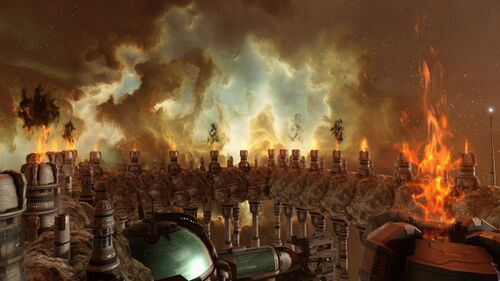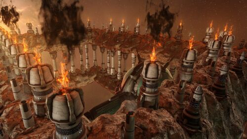 From a distance, the Natura Seminary resembles a fortress or reliquary drifting alone in the starlight. Closer, the details emerge: narrow asteroids, their spires aflame with burning pyres. The effect is both ceremonial and ominous, as though one approaches not just a school of philosophy, but a shrine that demands reverence.