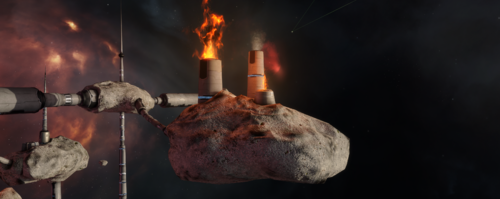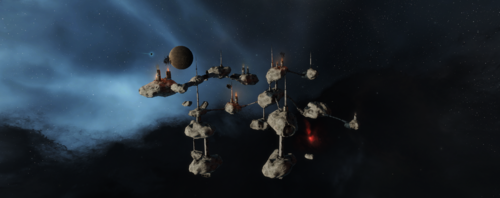 Perched above Friggi III Moon 1, a massive asteroid colony transforms the void of space into a bustling, habitable outpost. Stretching roughly 5,000 meters and linked by intricate connection tubes, its fire spewing chimneys are a clear sign of life.