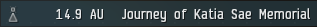 In recognition of Katia's epic journey across the stars, CCP Games honored the achievement in-game with the "Journey of Katia Sae Memorial", a monument located in her home system of Saisio. This is also the system where Katia started her grand tour of EVE Online.